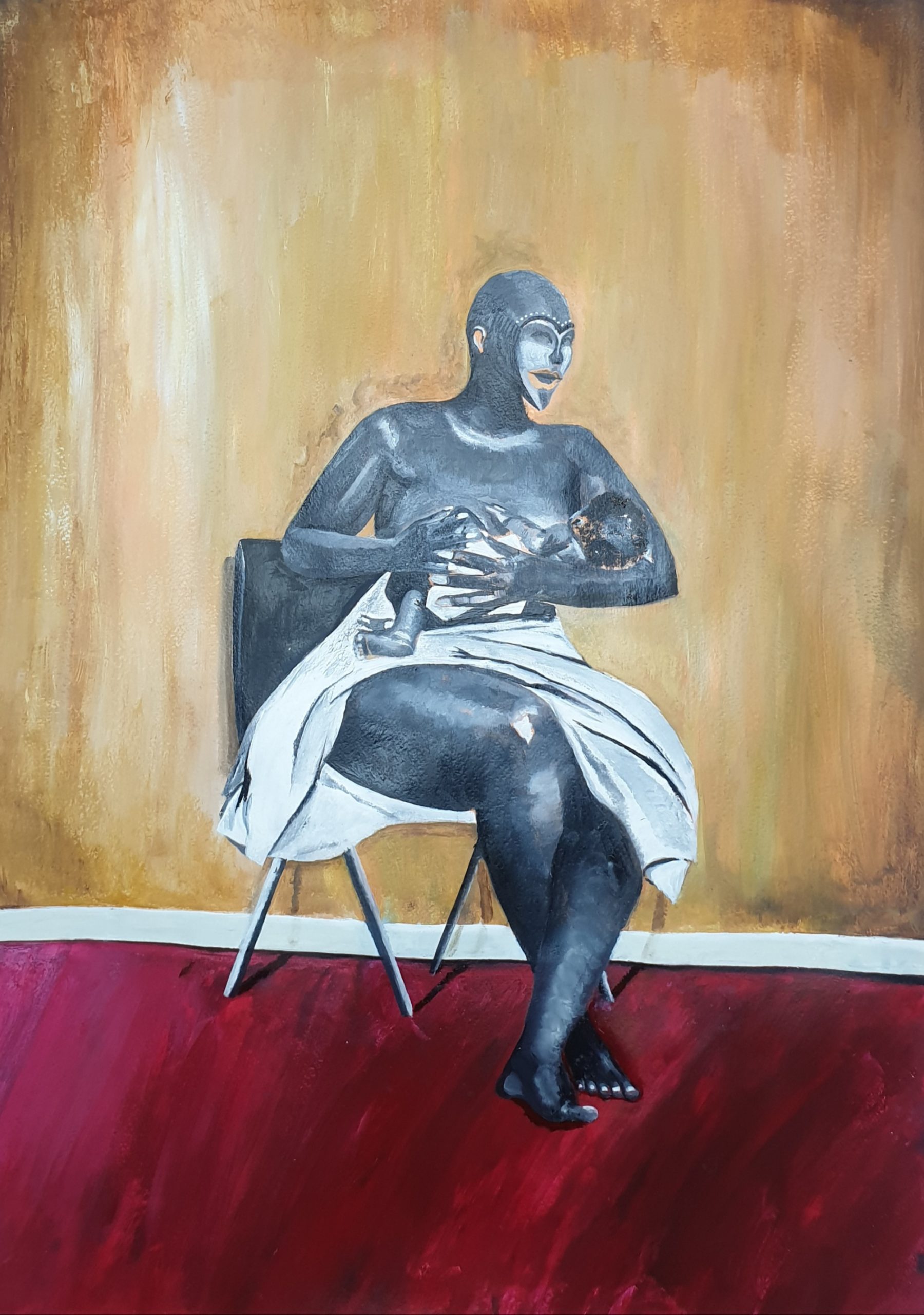 The central figure, a resolute African woman, not wearing a mask but having mask as her face. This mask symbolizes the multifaceted layers of heritage and identity that women carry, reflecting the rich tapestry that defines her existence, as she lovingly cradles and nourishes her child through breastfeeding.